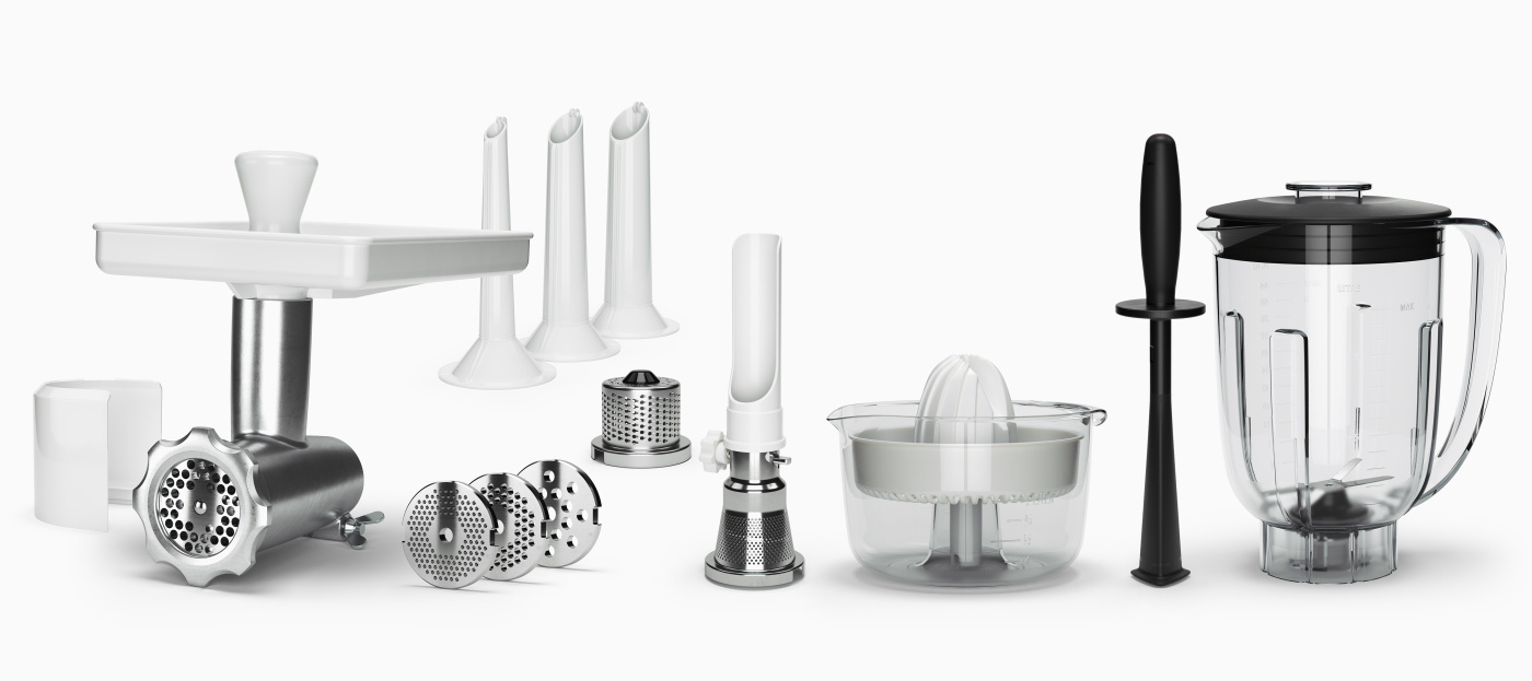 - Köttkvarn: Kvarnhus med kvarnvals, 4-bladig kniv, matarbord, matarpropp, stänkskydd till kvarn, 4 hålskivor: 2,5/4,5/6/8 mm