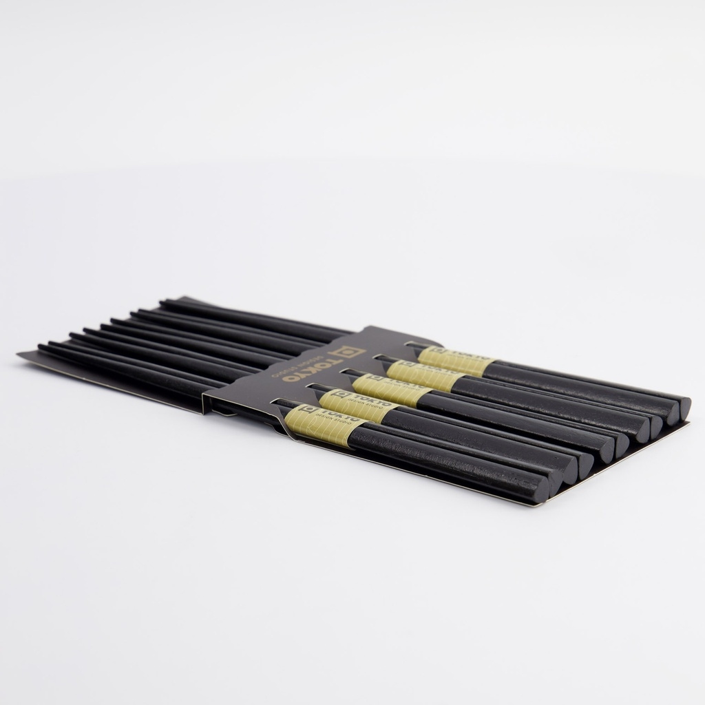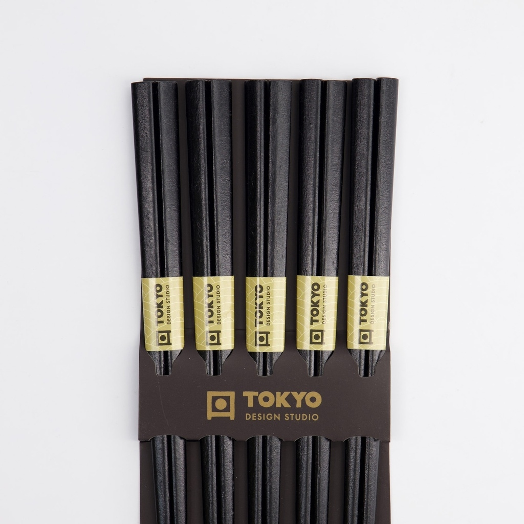 Ett elegant set med fem par ätpinnar i svart trä från Tokyo Design Studio, tillverkade med en matt finish som ger ett naturligt grepp och en taktil känsla. Ytan är lätt ruggad, vilket gör pinnarna behagliga att hålla i och ger extra kontroll vid plockning av ris, nudlar och små rätter.