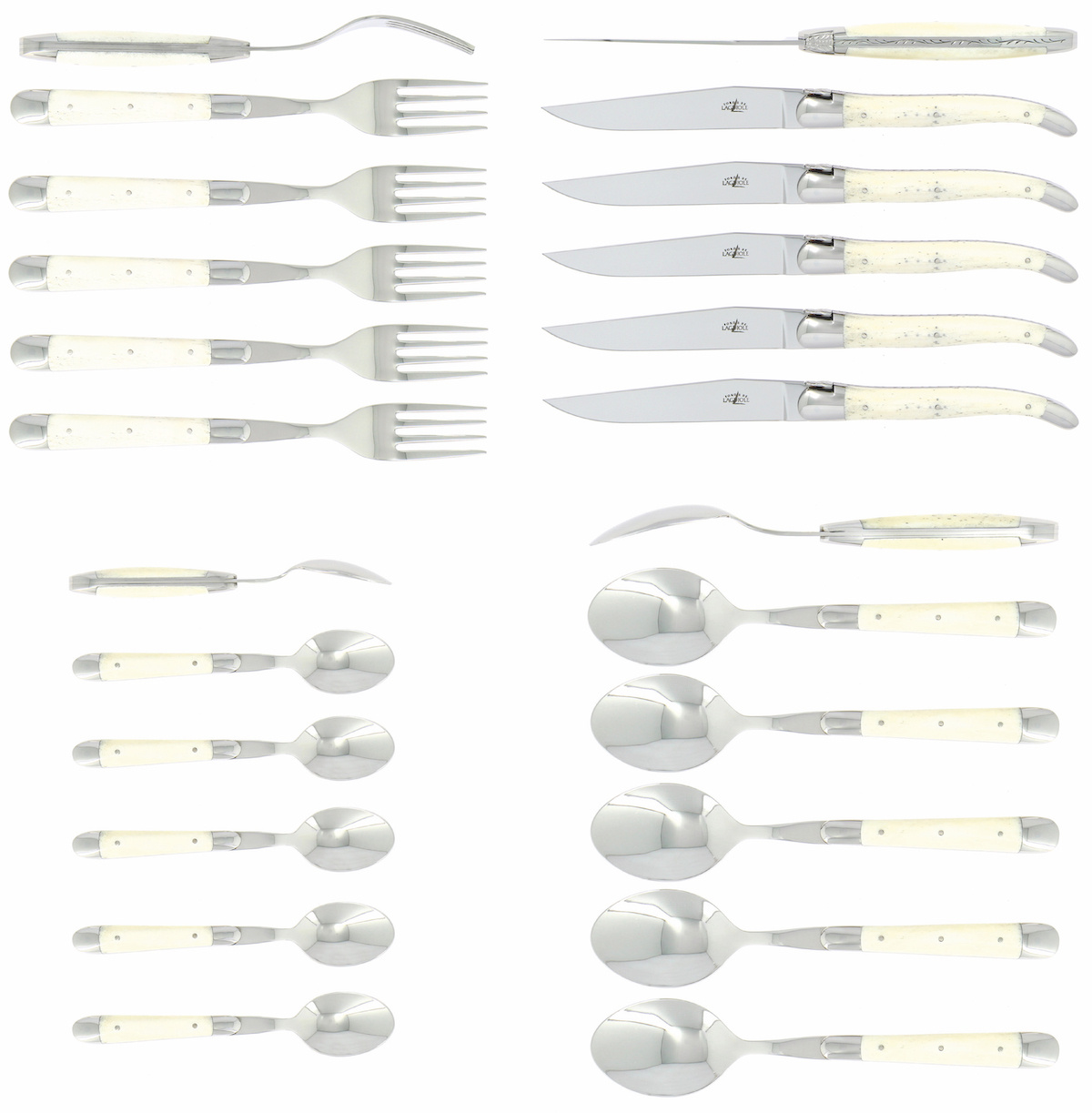 Detta bestickset innehåller 24 delar, sex gafflar, sex knivar, sex matskedar och sex dessertskedar. Allting levereras i en lika handtillverkad trälåda av ek som är utmärkt för förvaring. Handtagen är gjorda av ben från oxe (ursprung Frankrike).