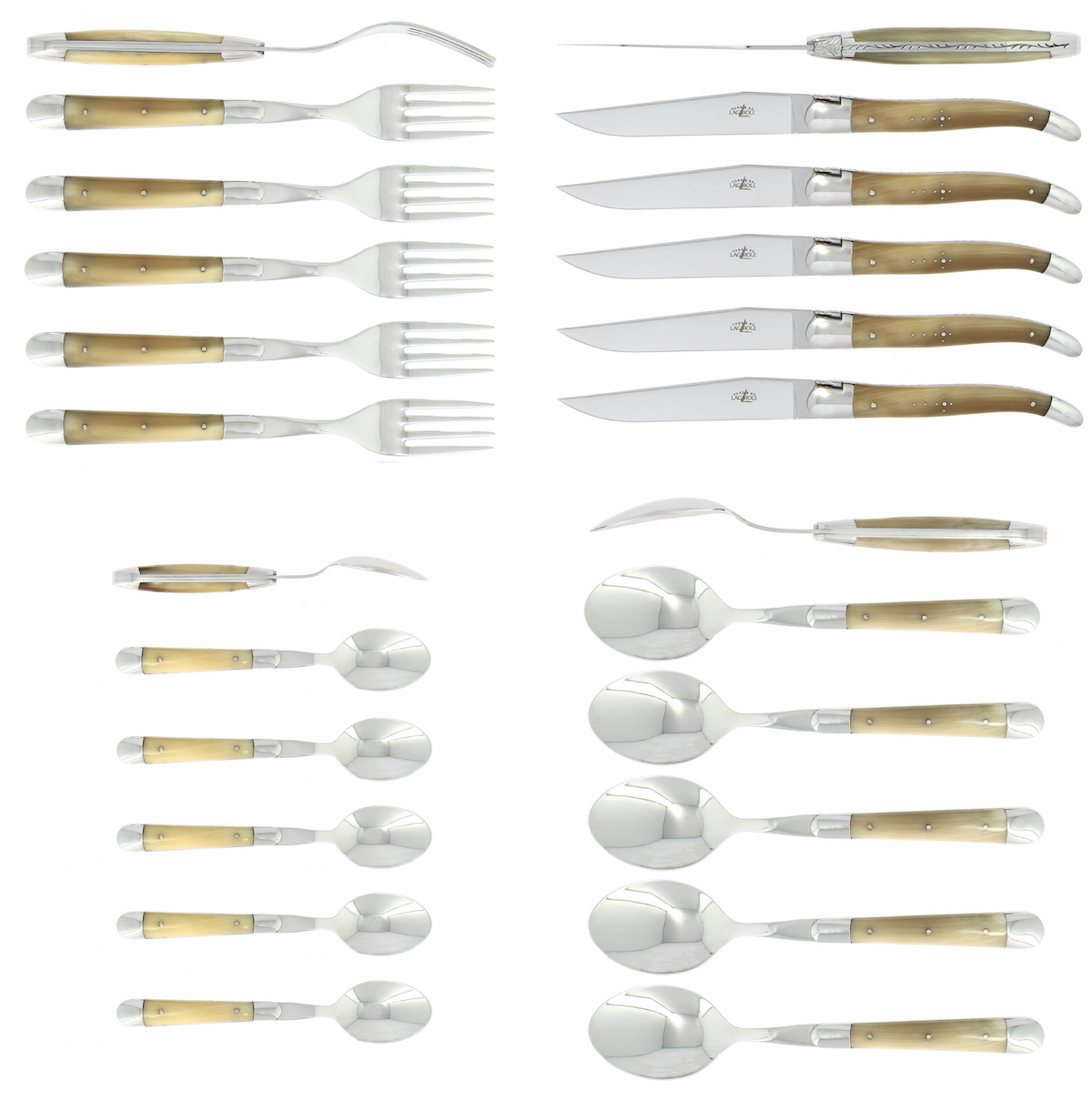 Detta bestickset innehåller 24 delar, sex gafflar, sex knivar, sex matskedar och sex dessertskedar. Allting levereras i en lika handtillverkad trälåda av ek som är utmärkt för förvaring. Handtagen är gjorda av horn från oxe (ursprung Nigeria) och på dessa har de ljusa delarna av de marmorerade hornen använts.