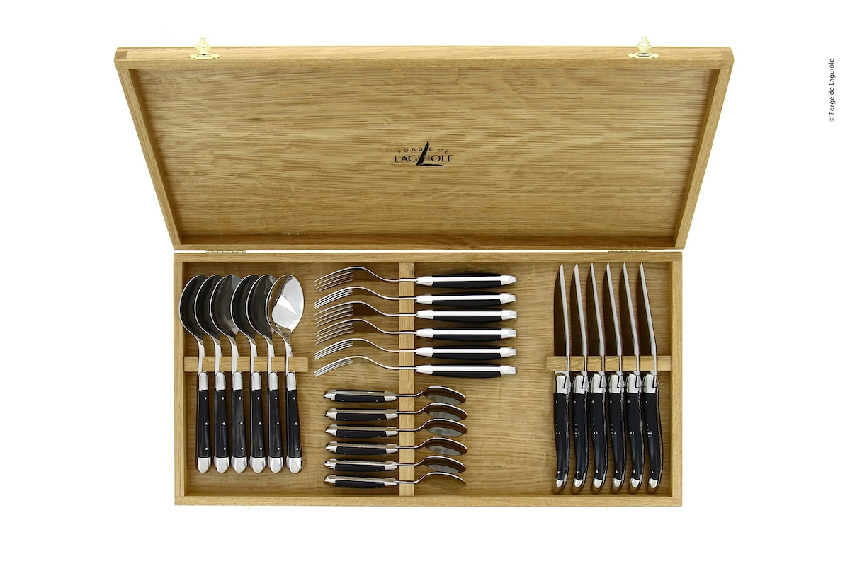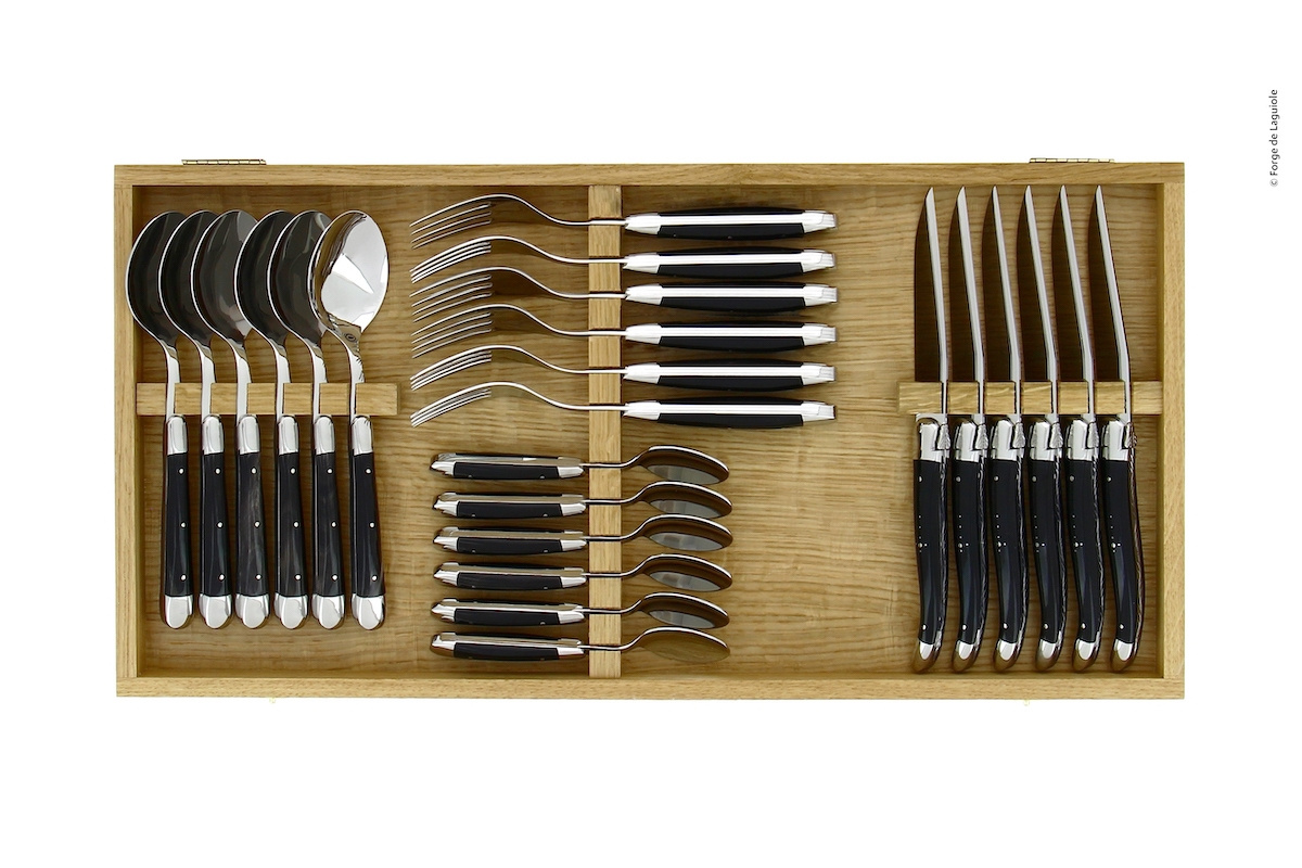 Detta bestickset innehåller 24 delar, sex gafflar, sex knivar, sex matskedar och sex dessertskedar. Allting levereras i en lika handtillverkad trälåda av ek som är utmärkt för förvaring. Handtagen är gjorda av horn från oxe (ursprung Nigeria) och på dessa har de mörka delarna av de marmorerade hornen använts.