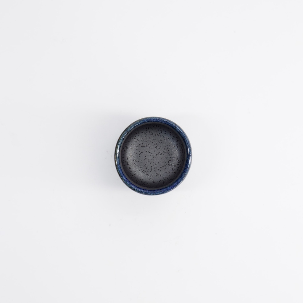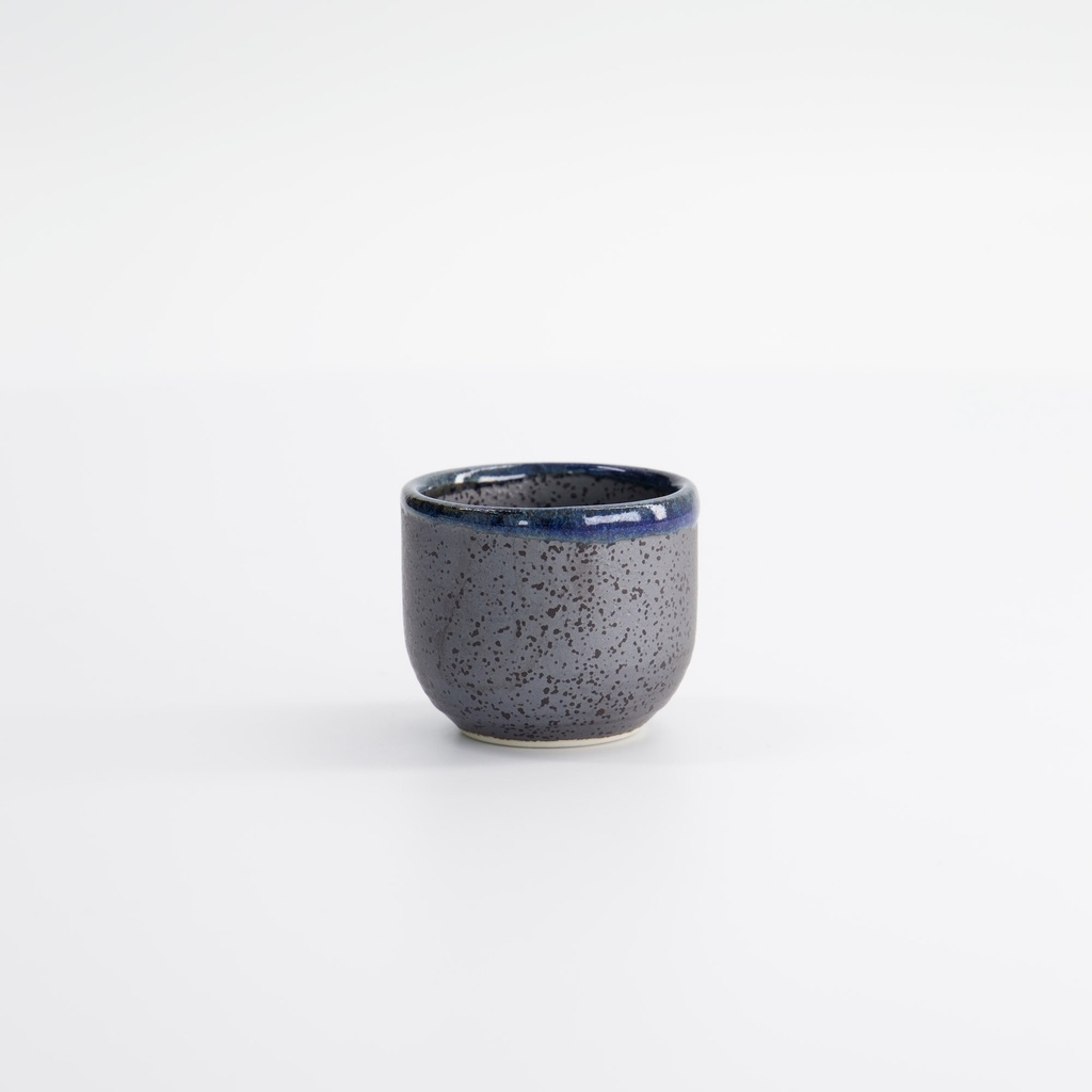 Den här modellen är tillverkad i keramik med en djupt blå glasyr som övergår i mörkgrå och svartprickig yta mot foten. Den skiftar i tonen som stilla vatten i skymning, där varje vinkel reflekterar ljuset olika. Färgen är inte bara dekorativ, den spelar en praktisk roll: blå glasyr används traditionellt för att framhäva sake med klar, nästan silvervit lyster – som ren junmai eller lätt kyld ginjo.
