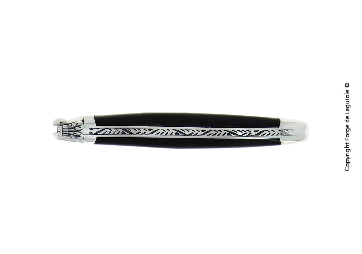 Forge de Laguioles raison d’être är och har alltid varit fällkniven. Det var här det började och det är ur den som allting springer. Denna fällkniv på 12 cm är en bra storlek för att använda som matkniv eller köttkniv vid en finare middag. Handtaget är gjort avhorn från oxe (ursprung Nigeria) och på dessa har de mörka delarna av de marmorerade hornen använts.