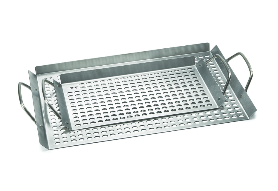 Perfekt för att grilla fisk, kött och grönsaker och mindre bitar av råvaror.Maten ramlar inte ner bland kolen men får en läcker grill- och röksmak ändå.Grillfaten har endast tre styck upphöjda kanter för enkel användning av stekspade etc.Två stycken grillfat i olika storlekar.Mått: inkl handtag 35×18 cm resp 44×28 cm