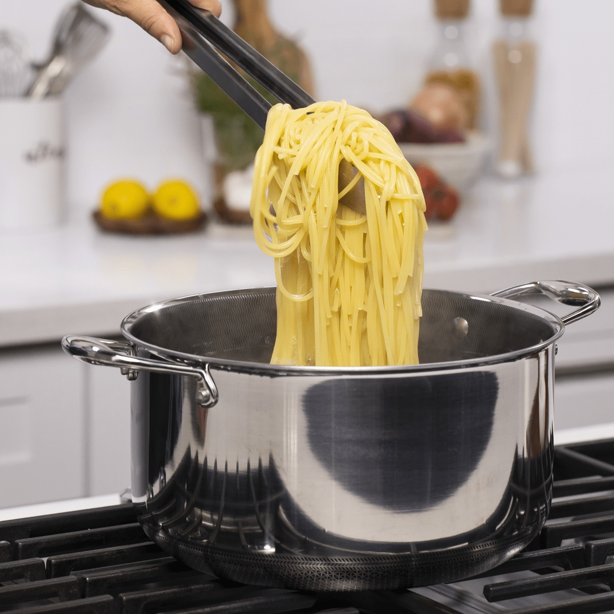 Hexclad Hybrid gryta med lock 7,6 L är en större gryta för rejäla kok - idealisk för grytor, soppor, långkok, större kötträtter eller matlagning till många. Den generösa volymen ger utrymme för större satser och långsam tillagning.