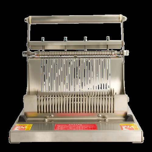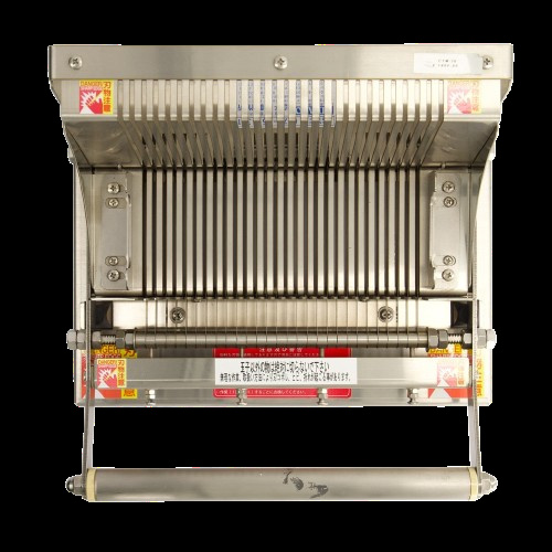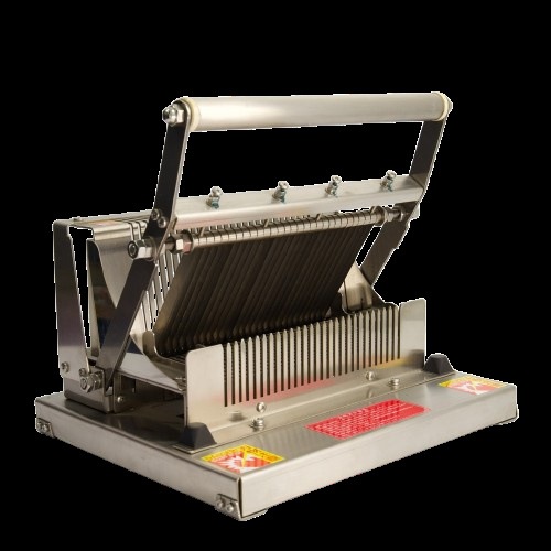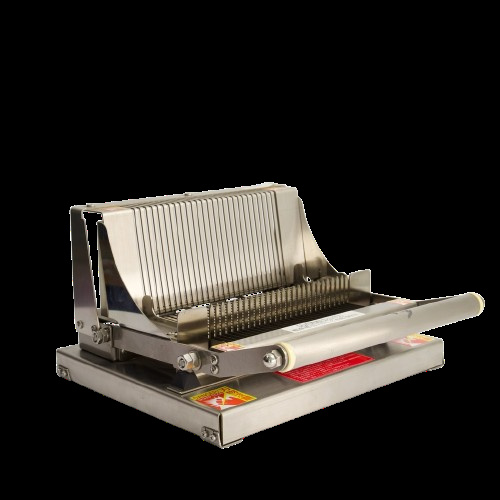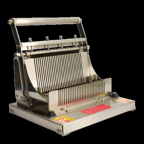 Konstruktionen är helt i rostfritt stål, vilket ger en hygienisk, stabil och lättskött produkt. Den tunga och stabila basplattan säkerställer att maskinen står ordentligt förankrad även vid snabb och repetitiv användning. Skärenheten består av 28 parallella rakblad i rostfritt stål, som skär konsekvent perfekta 7 mm-skivor i ett enda svep – utan att mosa råvaran. Det breda och ergonomiska grepphandtaget gör att användaren kan applicera ett jämnt och kontrollerat tryck, vilket sparar tid och minskar belastningen vid manuellt arbete.