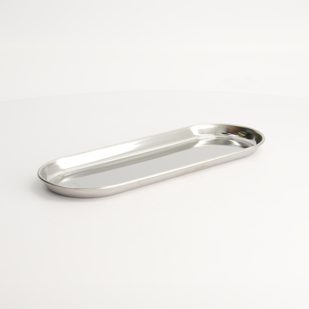 En enkel bricka i rostfritt stål som ser ut som den hör hemma i en operationssal, vilket inte är helt fel.