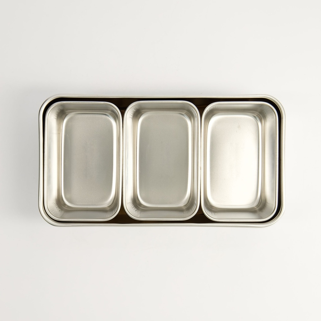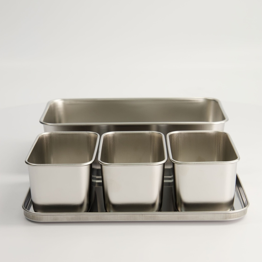 Japanska mini-lådor i rostfritt stål som kan användas till mise en place i restaurangkök för att hålla små ingredienser separerade och tillgängliga utan att de tar över arbetsytan. Varje insats är löstagbar, vilket gör det enkelt att byta ut, diska och flytta innehållet mellan stationer.