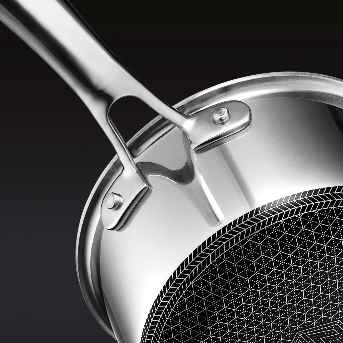Hybridteknologin kombinerar rostfritt stål med en strukturerad yta som ger viss nonstick-effekt och gör grytan både robust och lättare att rengöra än traditionellt stål. Den trekikta konstruktionen med aluminiumkärna inuti stålet ger snabb och jämn värmespridning - perfekt för temperering, sjudning och tillagning där du vill undvika hotspots.