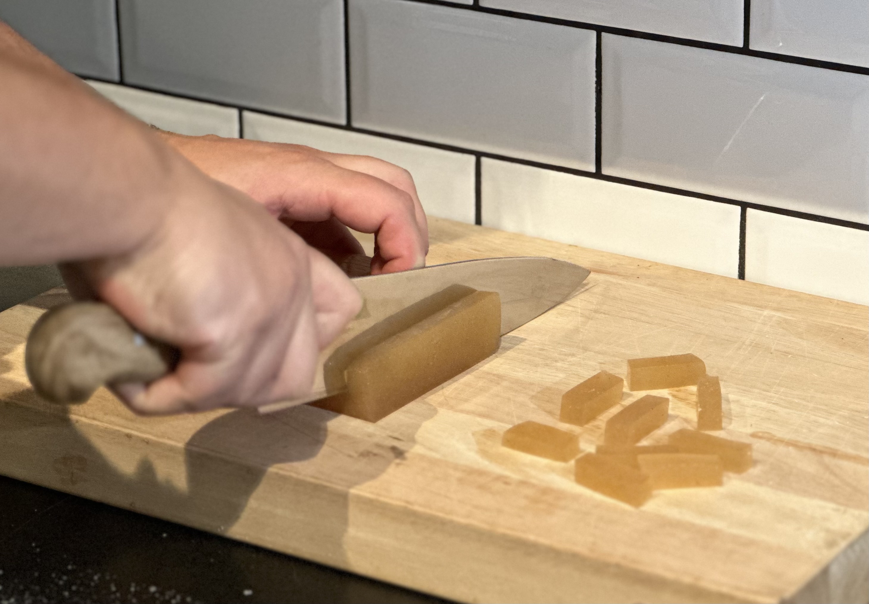 Det tredje receptet är en klassisk Pâte de fruit. Ett mer kontinentalt och klassiskt julgodis som vi här har valt att göra på päron. Det går att göra på alla möjliga sorters frukt, men kan då behöva anpassning av pektin- och sockermängd.