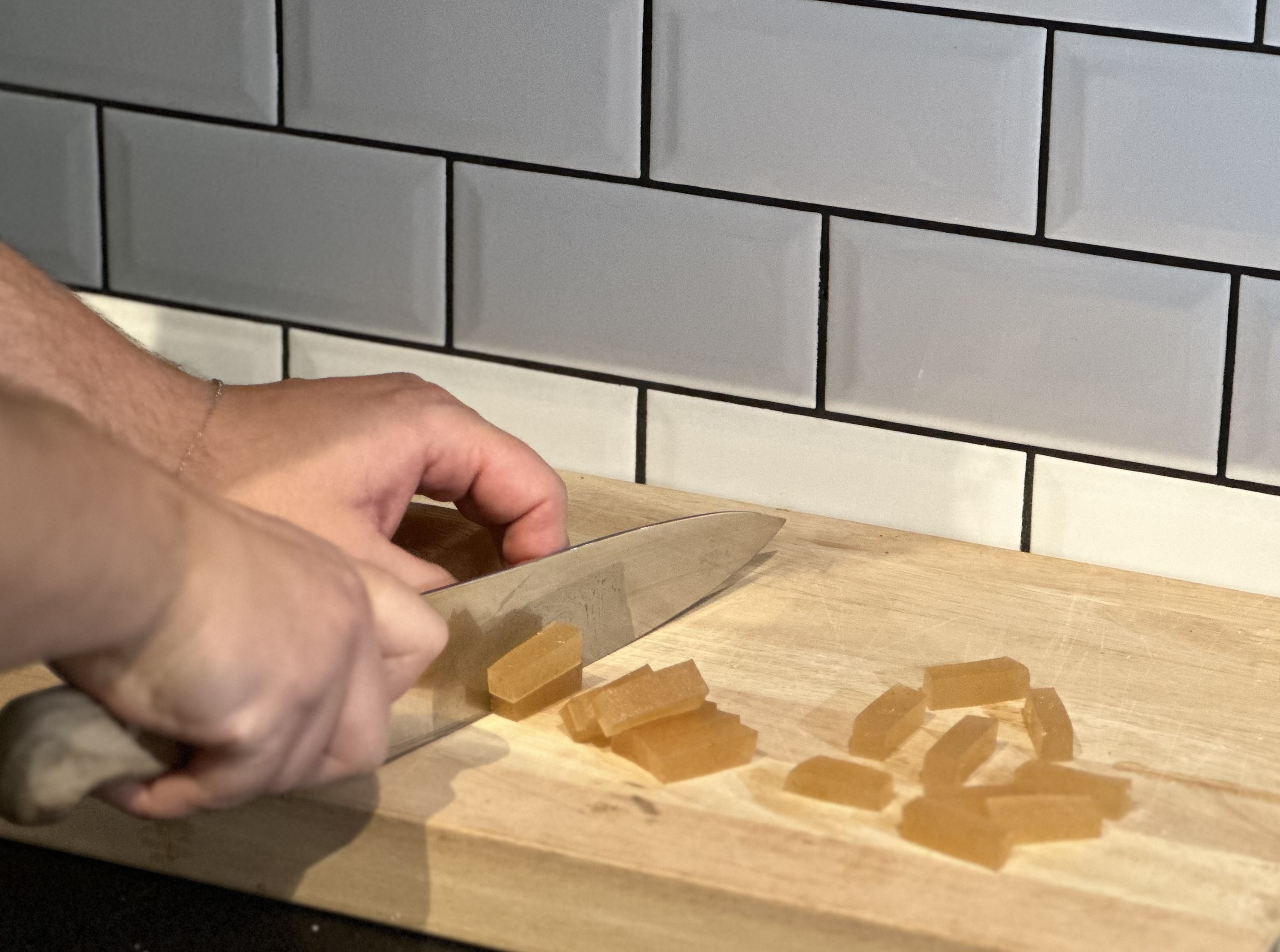 Först ut är ett gelegodis där vi har bytt ut gelatin som den gelerande substansen för att passa alla. Med rätt temperatur och Karragenan Kappa går det att uppnå ett mycket trevligt resultat, smaken går att variera i oändlighet tack vare vårt stora sortiment av smakdroppar.