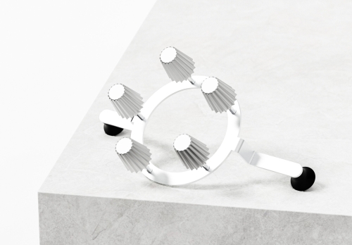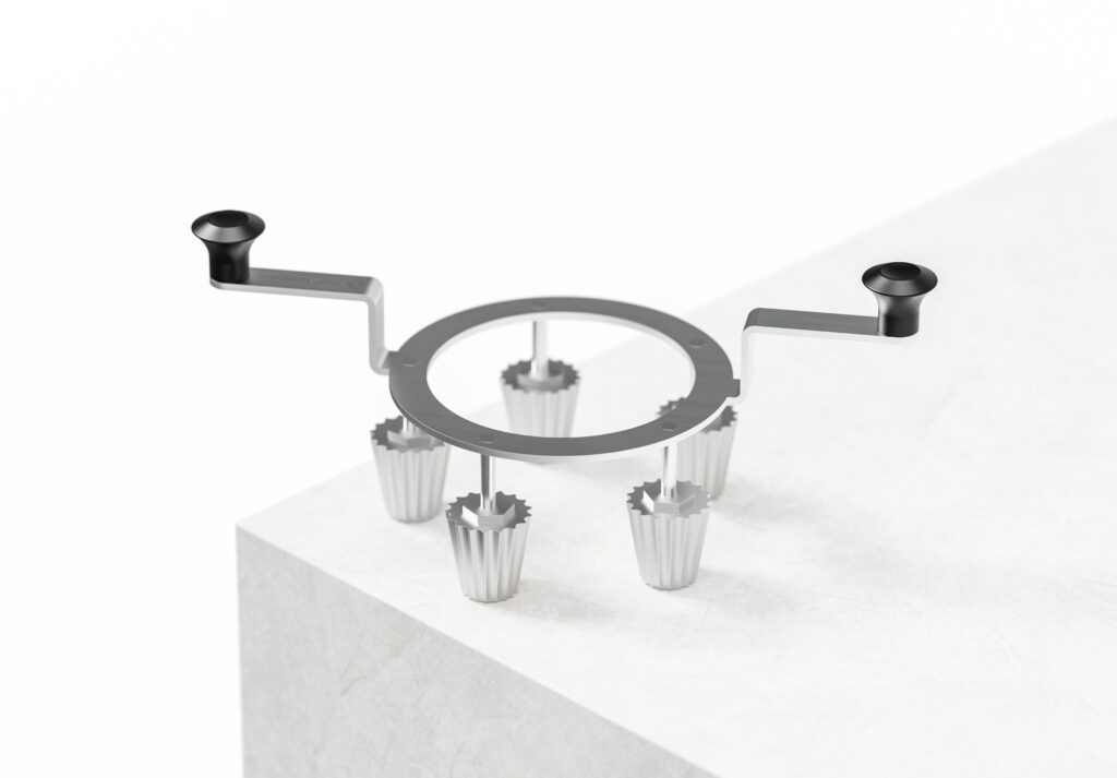 Original Small (5 pcs) + Basket är produktionsversionen av Original Small Pie Tee. Korgen håller fem krustadjärn i ett fast läge och sänks ned i oljan som en enhet, vilket innebär att fem skal formas, friteras och lossnar i ett enda moment. Järnen är identiska med det enskilda originalet: Ø 3,2 x 3,5 cm med en bottendiameter på 2,0 cm, tillverkade i livsmedelsgodkänt aluminium i Nederländerna.