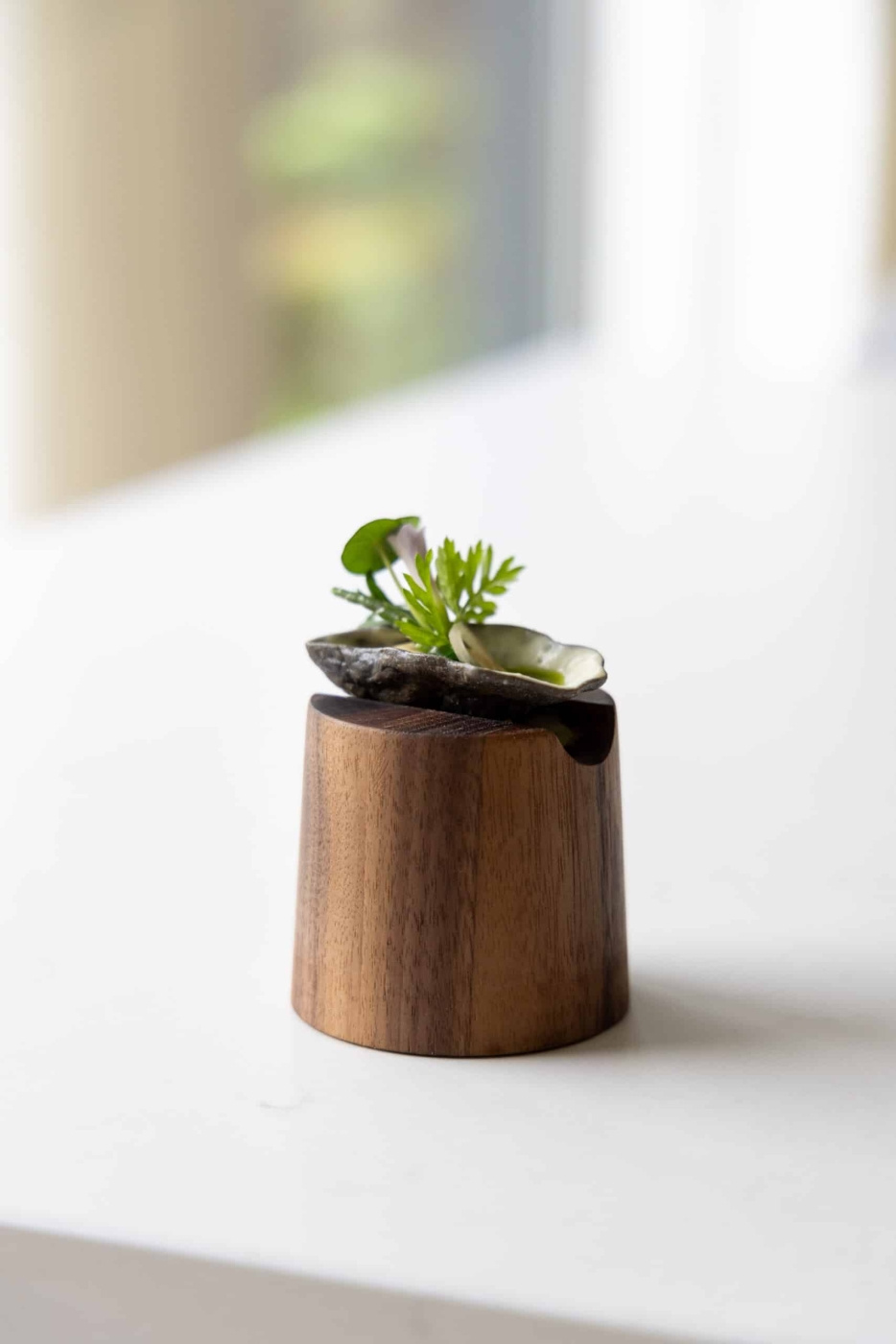 Det uppenbara är trompe l'oeil: ett knaprigt ostronskal som serveras med en fyllning som imiterar det råa originalet. En salingel av gurka och sjövatten med en kall emulsion av crème fraîche och citronverbena som smälter mot gommen på ett sätt som för tankarna till det riktiga. Men det är lika intressant att spela mot formen snarare än med den. Ett ostron fyllt med en varm kräm av rostad blomkål med en droppe hasselnötsolja och en skiva fermenterad silverlök ovanpå, knaprigt och hett och syrligt på en gång, är en amuse-bouche som inte behöver förklara sig.
