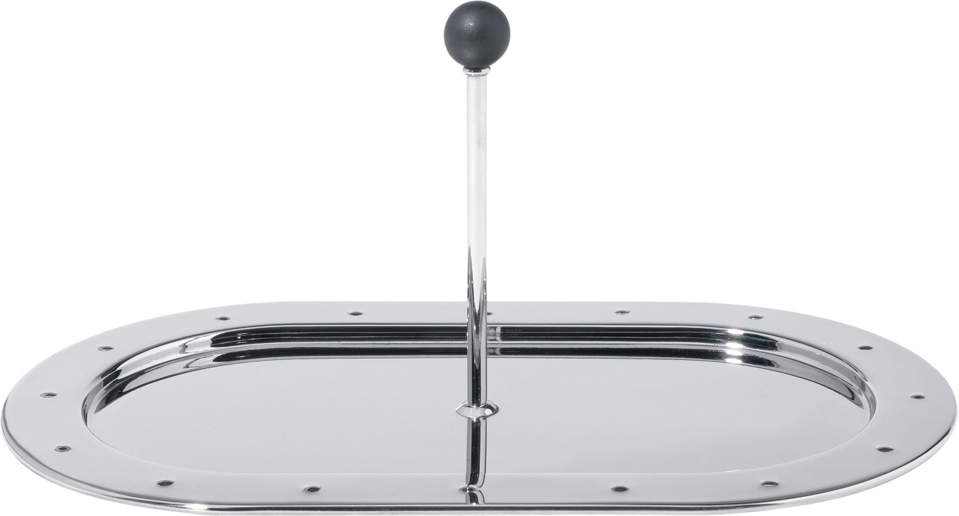 Liten bricka högblankt 18/10-stål med knopp i svart plast. Mått: 28,5 x 16,5 cm Höjd: 12,5 cm Design: Michael Graves