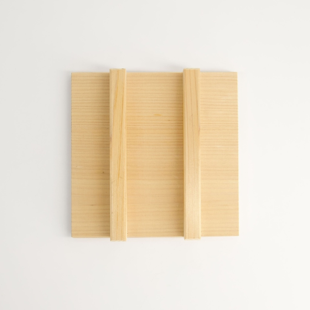 Lockets utformning är enkel men genomtänkt: en plan träskiva med två tvärgående handtag som gör det lätt att greppa och lägga på med en hand. Trä leder inte värme som metall, vilket gör att man kan arbeta snabbt utan att bränna sig, och ytan absorberar en del av fukten från ägget, vilket bidrar till den torrare, elastiska yta som kännetecknar en bra tamagoyaki.