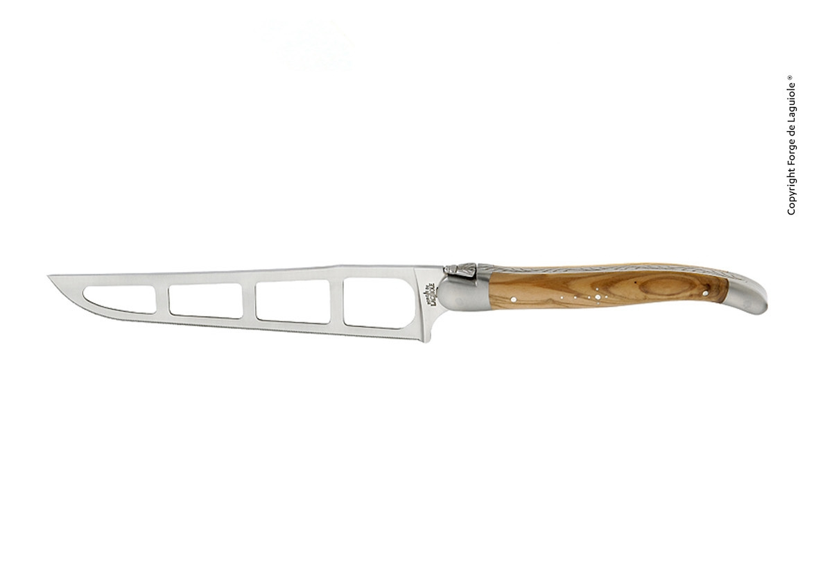 Här en klassisk ostkniv med luftspalter för att inte fastna och kladda med mjuka ostar och kittostar. Handtaget är gjort av olivträ med en ljus och oefterhärmeligt snygg look.
