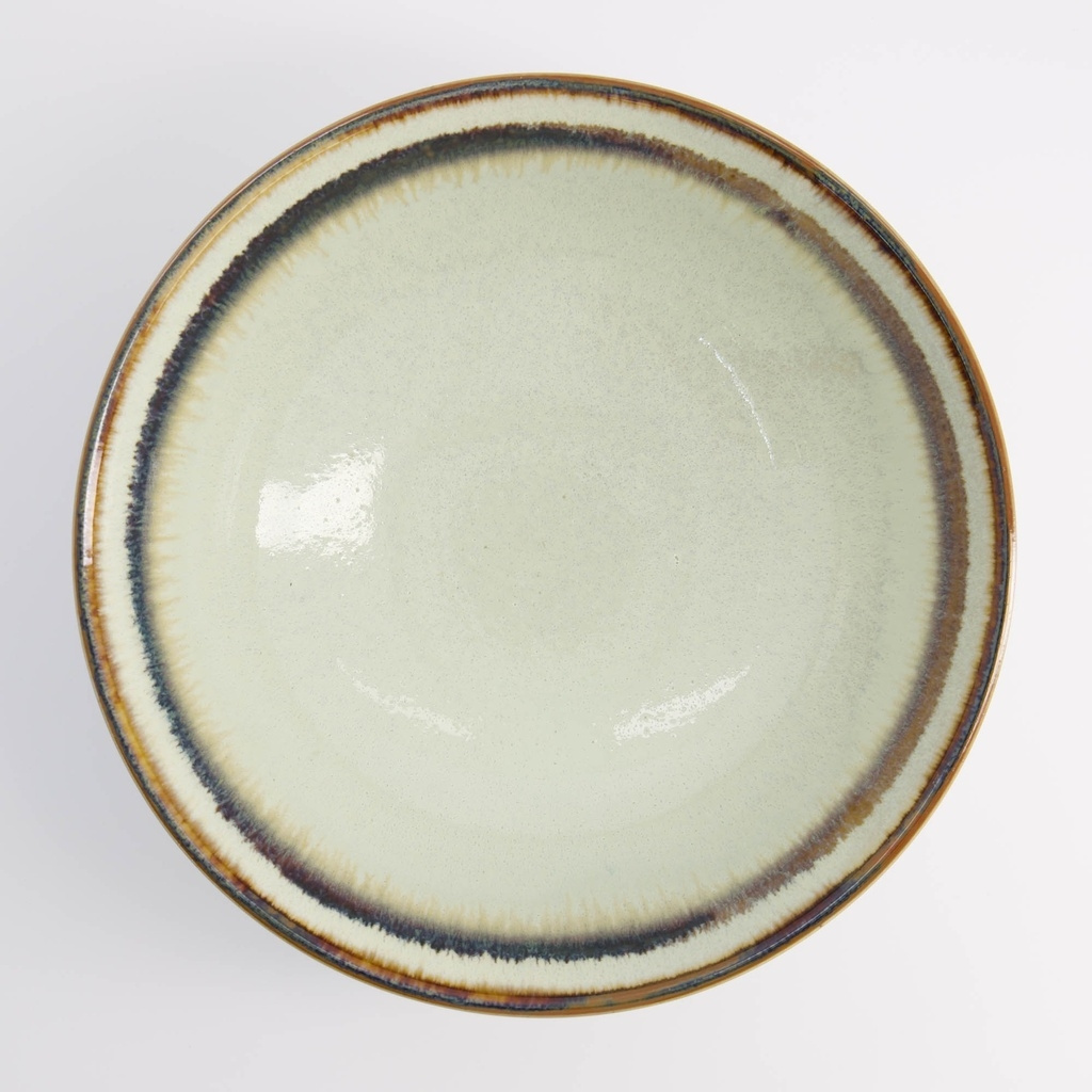 Den här ramenskålen, Wasabi, har en mjuk grön glasyr som skiftar i toner från ljus jade till djupare oliv med subtila drag av brun och blått längs kanten. Den glasyreffekt som japanerna kallar yūhen ger varje skål ett unikt uttryck, som om färgen rör sig levande över ytan.
