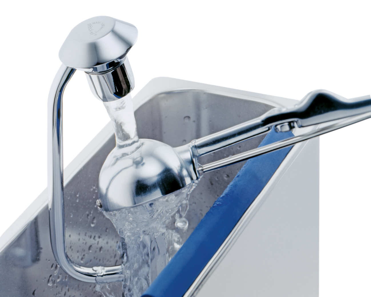 Stöckels rengöringsvask är en robust och praktisk lösning för alla miljöer där utrustning snabbt och hygieniskt ska rengöras mellan användningar. Många gånger har jag sett att det geggas med en glasskopa upp och ner i en bytta med vatten som blir lika grumligt som omständigheterna kring ordförandevalen i FIFA redan efter första gången skopan doppas. Här kan du istället skölja av skopan på ett smidigt sätt. Då du pressar skopan mot munstycket aktiveras vattenspolningen på bägge sidor, och upphör omedelbart när du är färdig. Snabbt, enkelt, hygieniskt och utan att slösa vatten eller tappa tempo i serveringen. Funkar naturligtvis liga bra med andra saker, som avsmakningsskedar, portionsskedar och annat som annars lätt kan få något oklara omständigheter i ett kök.