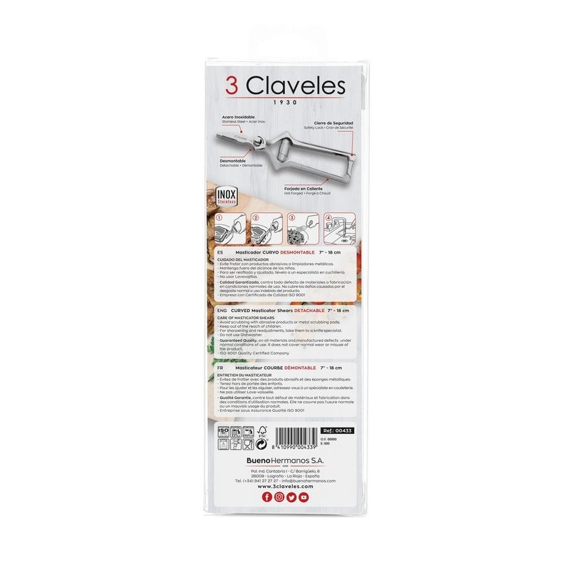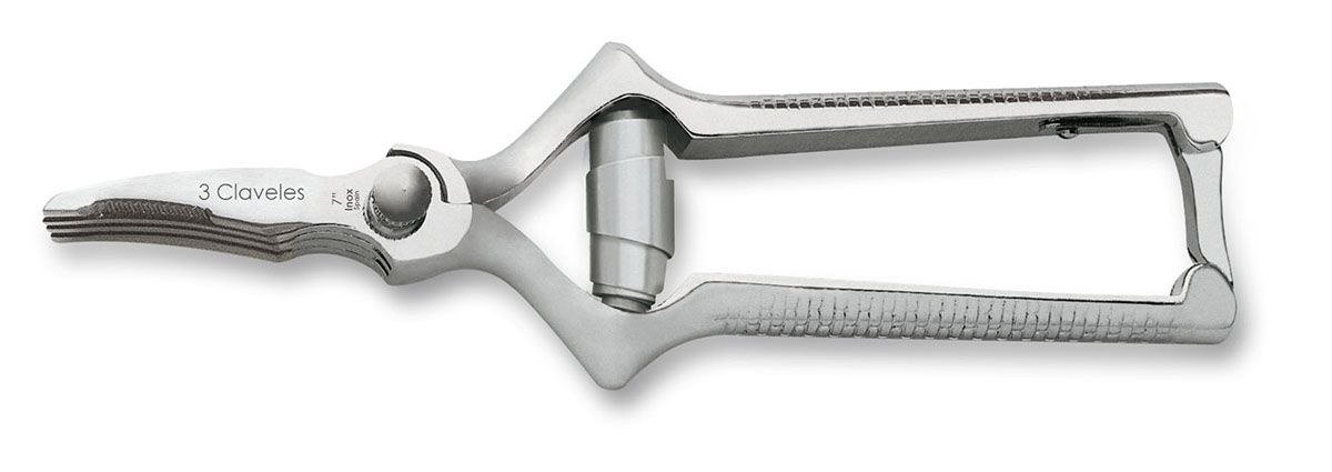 Den här böjda masticator-saxen från 3 Claveles är ett verktyg för dig som vill jobba med struktur på ett mer nyanserat sätt. De parallella bladen arbetar inte bara genom råvaran utan finfördelar och strimlar, vilket gör den perfekt när du vill ta fram rätt textur i kött till tartar, råbiff eller andra komponenter där konsistensen gör skillnad. Den böjda formen ger dig en naturlig arbetsvinkel så att du kan följa råvarans konturer och arbeta nära och exakt, snarare än att klippa rakt igenom som med en vanlig sax.