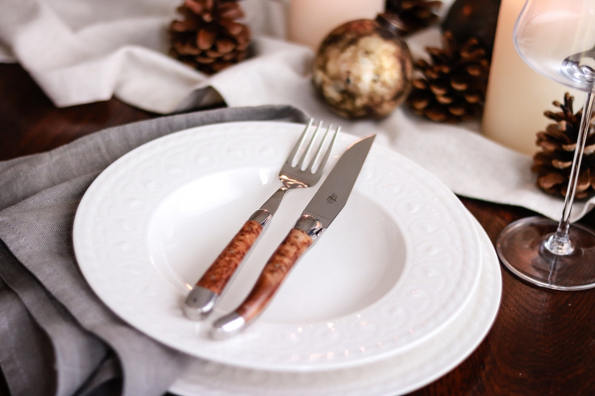 Här tummas inte en millimeter på kvaliteten utan varje bestick som lämnar den lilla fabriken är finjusterad på detaljnivå. Bladen av franskt rostfritt T14-stål smids på plats i fabriken i 1000-gradiga ugnar. Handtagen av trä eller djurmaterial skärs och poleras för hand av rutinerade knivmakare och passformen på knivbladet är himmelsk. Allting är perfekt! Det här är bestick som blir hemmets eller restaurangens självklara krona på verket och en njutning vid varje användning!