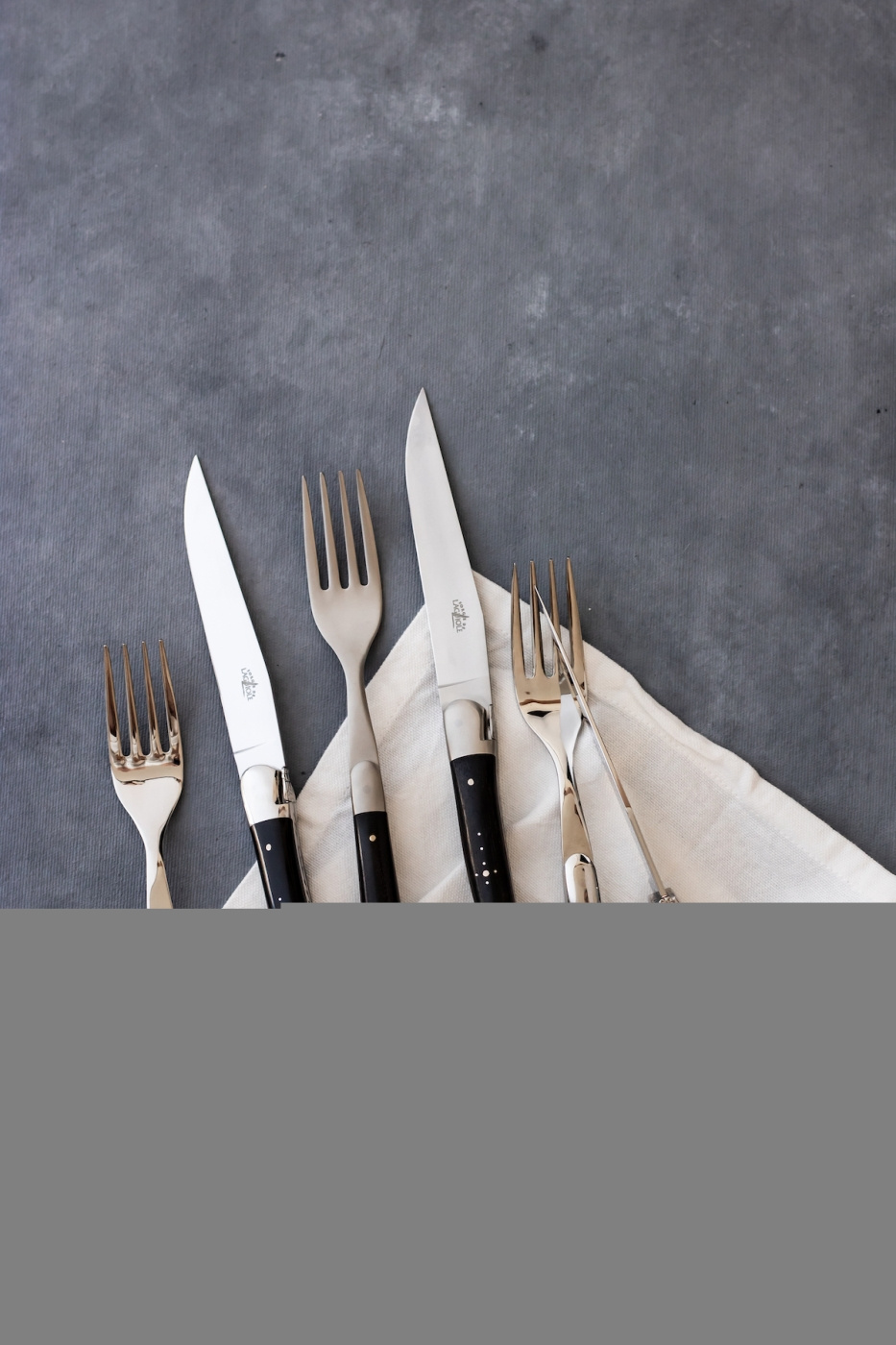 Här tummas inte en millimeter på kvaliteten utan varje bestick som lämnar den lilla fabriken är finjusterad på detaljnivå. Bladen av franskt rostfritt T14-stål smids på plats i fabriken i 1000-gradiga ugnar. Handtagen av trä eller djurmaterial skärs och poleras för hand av rutinerade knivmakare och passformen på knivbladet är himmelsk. Allting är perfekt! Det här är bestick som blir hemmets eller restaurangens självklara krona på verket och en njutning vid varje användning!
