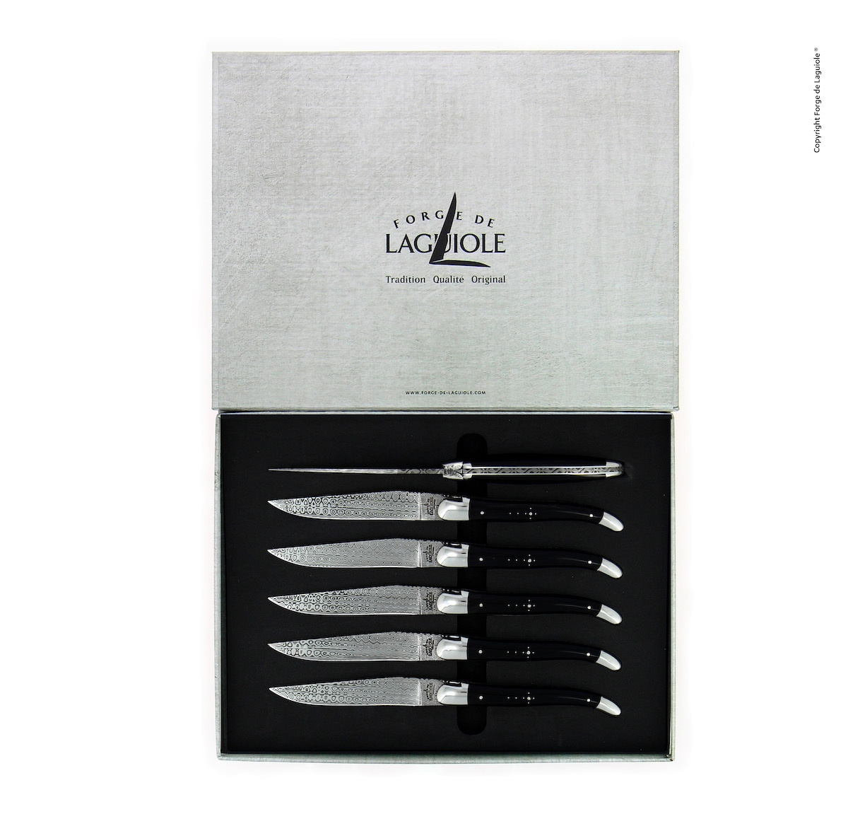Sex knivar, Handtag av Mörkt Horn, damaskerade, Collection - Forge de Laguiole