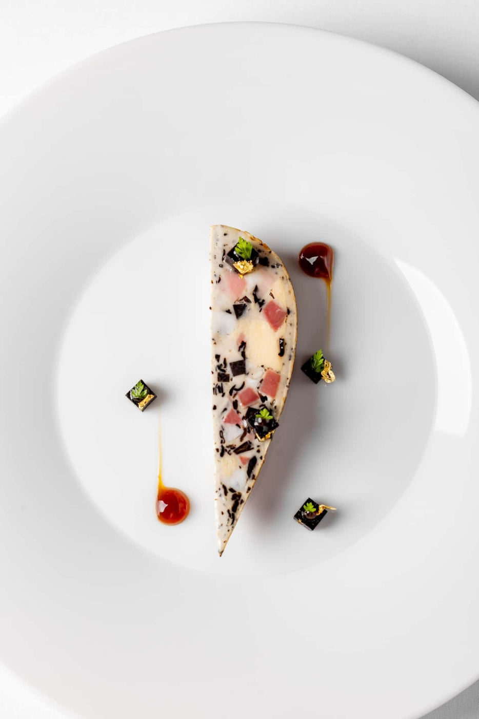 Forestière-traditionen bär med sig skogens råvaror: svamp, örter, markens djupa karaktär. I Dillings tolkning skruvas det upp med svart tryffel och rökt ankbröst, komprimerat till en portionsberedning med droppformens naturliga riktning på tallriken. Interiörformen, tillgänglig separat, skapar ett dolt inre element för ytterligare ett lager dramatik vid anrättning.