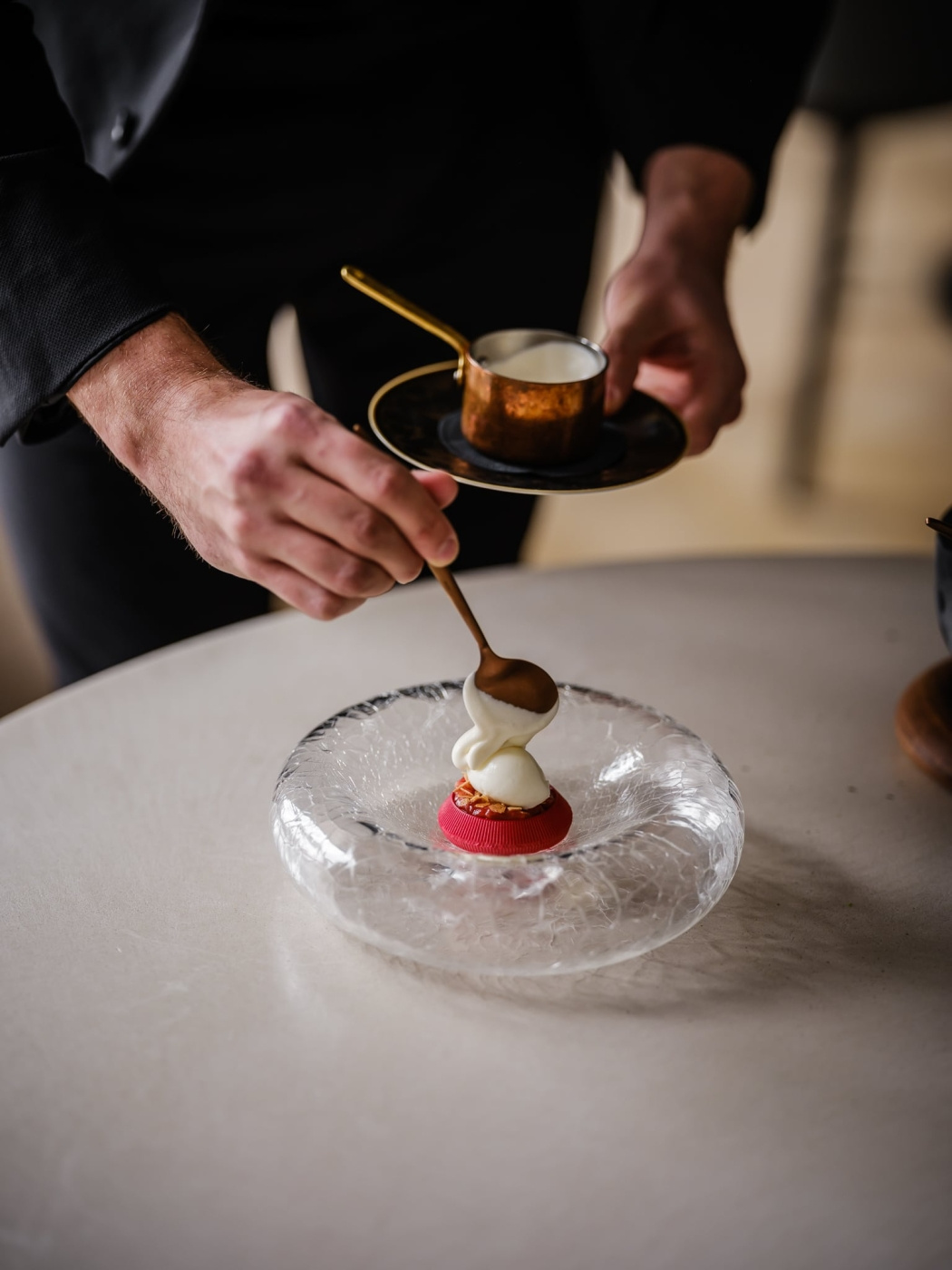 I kondisköket: en mousse av rostad vit choklad och björksav med ett inlägg av syrad havtornskräm, eller ett karamelliserat socker i formen med lingongelé i fördjupningen. I det varma och kalla köket: en kallsatt fiskmousseline med inlägget fyllt av varm dillolja som hälls vid bordet, en purjolökscrème med koncentrerad lammfond i fördjupningen, eller en getostmousse med rödbetsgelé och valnötsolja. Formen är i 100% livsmedelsgodkänt silikon.
