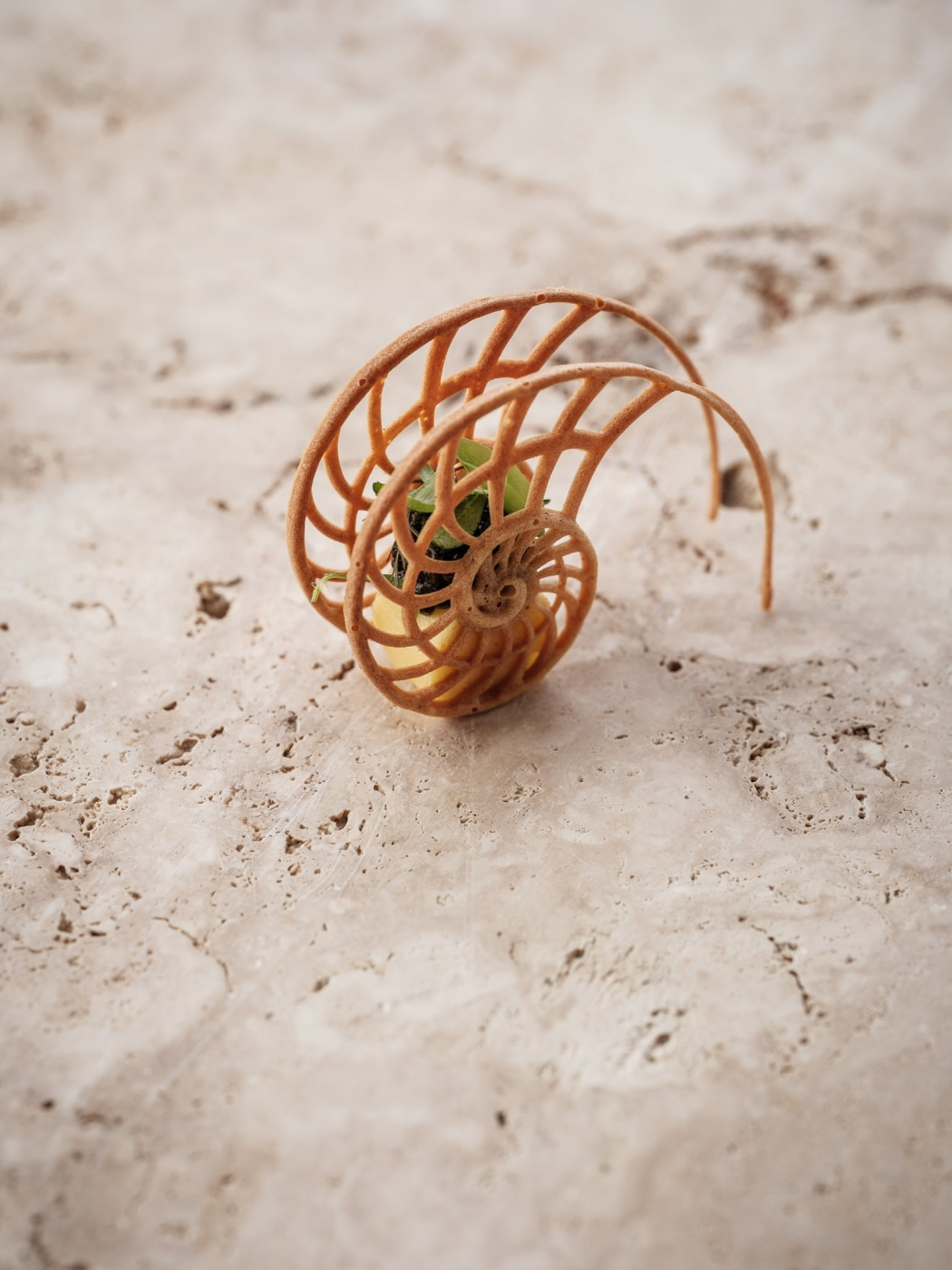 Tuilen bakad i formen ger ett lättviktigt, krispigt skal med spiralens exakta räfflor och symmetriska kurva bevarade i varje gräddning. Det är en form som kommunicerar innan den smakas: gästen läser havet, matematiken och hantverket i samma ögonblick.