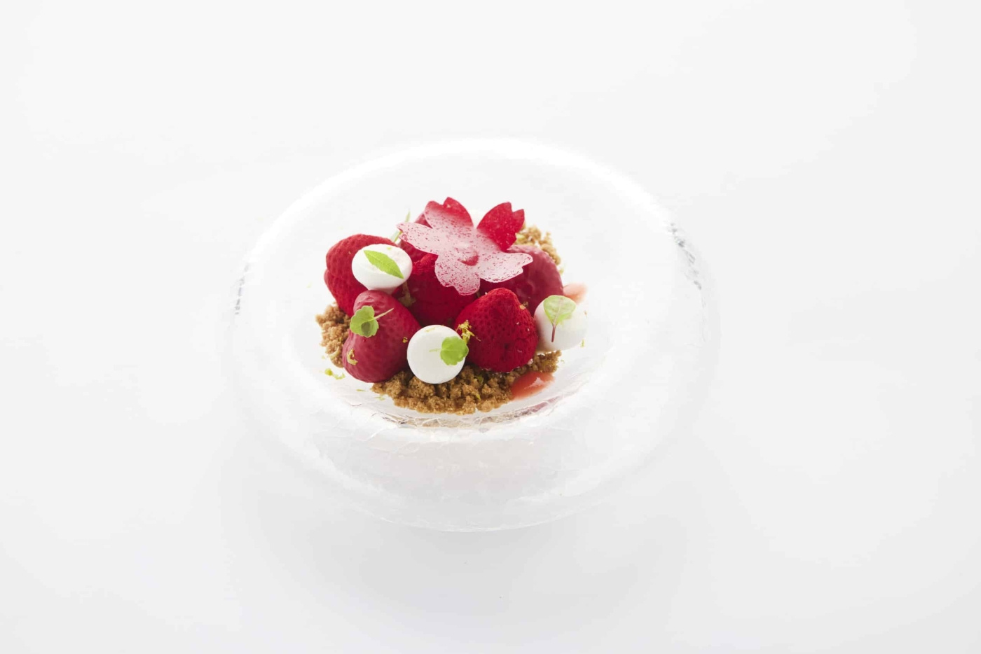 Det som avgör resultatet är ytans precision. De små fröfördjupningarna kräver en massa som fyller utan att kapsla luft, samtidigt som den släpper rent utan att riva upp detaljerna. Arbeta med släta beredningar som gelé, mousse eller crémeux och frys för ett kontrollerat urtag. De två positionerna gör att flera jordgubbar tillsammans upplevs som naturligt spridda snarare än upprepade.