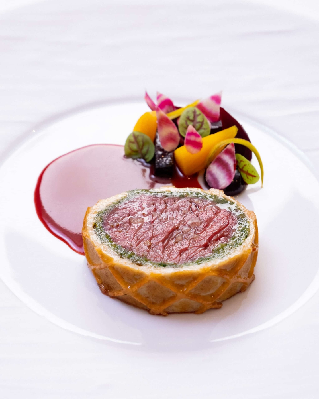 I köket: en klassisk uppbyggnad med kycklingfarce och brioche som bakas och serveras som ett eget element, en fiskfarce med örter och citrus som skivas och serveras varm eller kall, eller en viltfärs med svamp och kryddor där varje skiva blir en exakt repetition av den förra. Formen gör det möjligt att arbeta med Wellington-idén utan att vara bunden till dess traditionella yttre, och istället låta kärnan ta plats på tallriken.