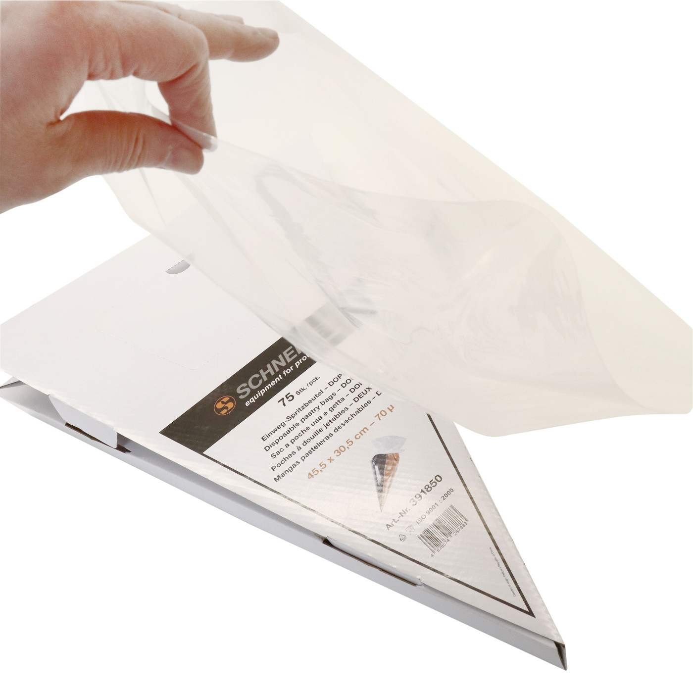Dubbelextruderat material med slät insida och hög svetsfogstyrkhet. Spetsen är sluten och påsen kan användas utan tyll. Transparent, buntad, 455×305 mm. Förpackning med 75 påsar med uttagsöppning i kartongen.
