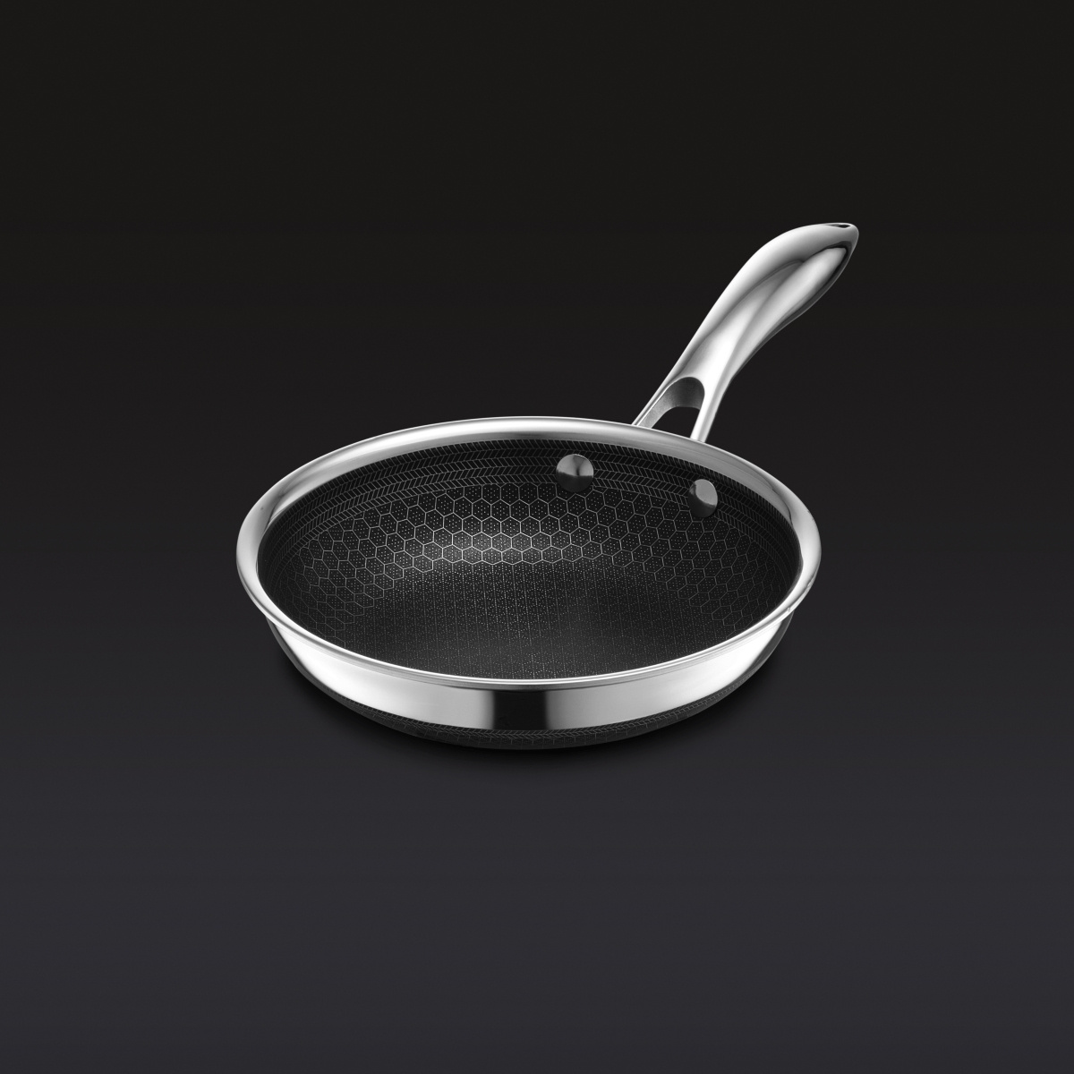 - Hybridstekpanna med rostfritt stål, aluminiumkärna och keramisk hybridbeläggning