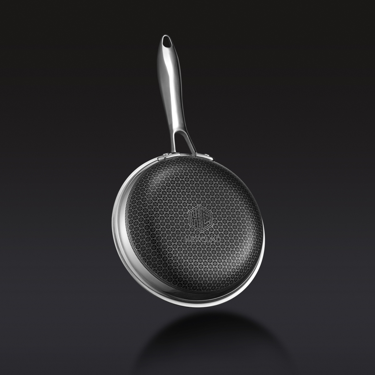 Hexclad Gordon Ramsay-stekpanna är en hybridstekpanna som kombinerar egenskaper från rostfritt stål, nonstick-liknande yta och gjutjärnslik värmehållning i ett och samma kärl. Den lasergraverade hexagonmönstrade ytan innebär att rostfria toppar ger bra stekyta, medan de sänkta fälten med hybridbeläggning gör att maten släpper lättare och förenklar rengöringen.