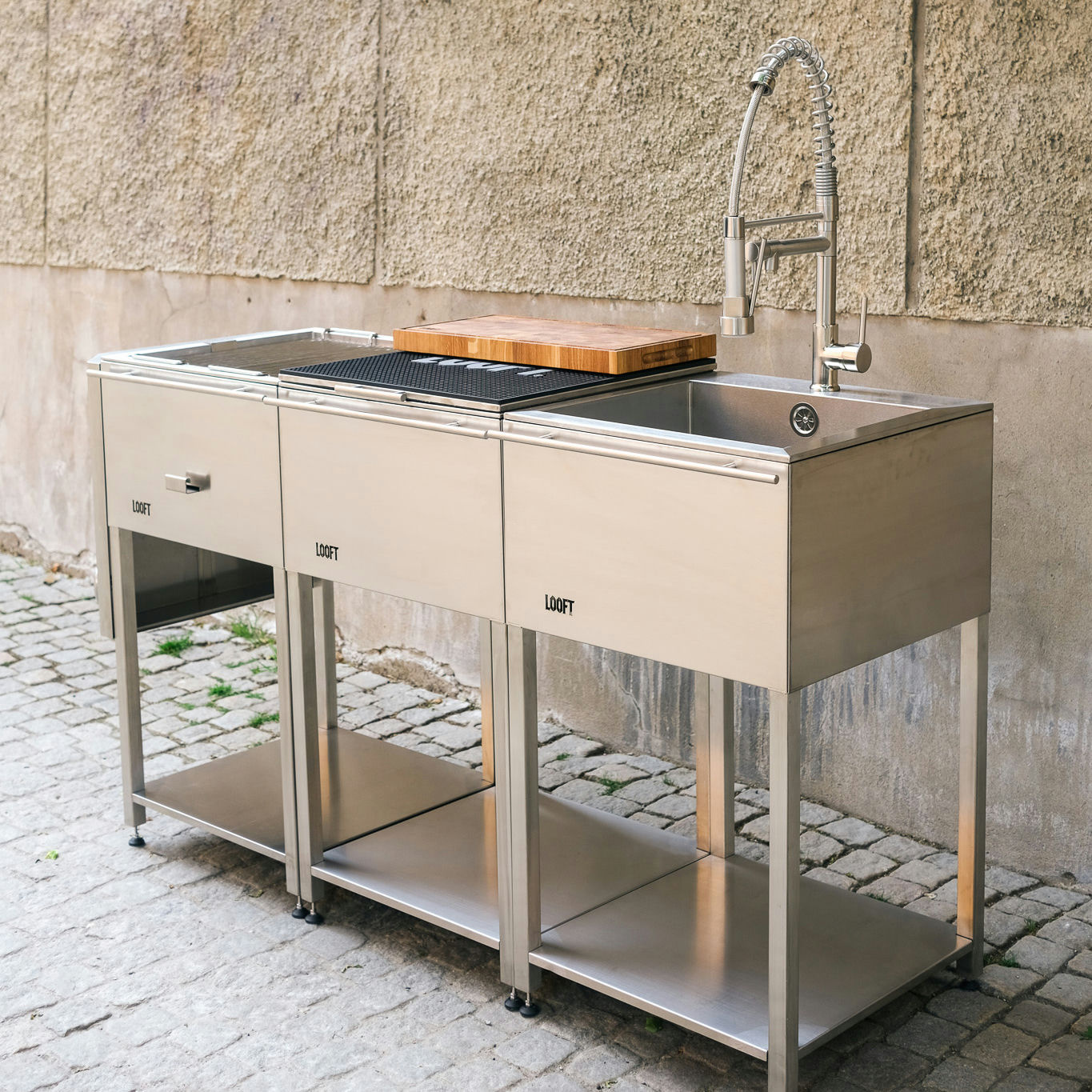 Detta är en komplett och praktisk lösning för utomhusmatlagning. Den innehåller Loofts högkvalitativa kolgrill, en rostfri arbetsbänk och en diskho med kran för smidig matlagning och rengöring. Den stilrena designen gör den både funktionell och hållbar – perfekt för alla utomhusaktiviteter och sammankomster.