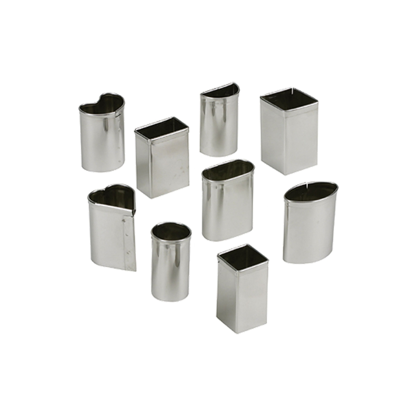 Setet innehåller nio utstickare i rostfritt stål i nio klassiska petit fours-former: båge, kurva, diamant, hjärta, oval, rund oval, rund, rektangel och kvadrat. Formvariationen täcker det traditionella petit fours-sortimentet och möjliggör konsekvent formgivning utan att byta verktygsset.