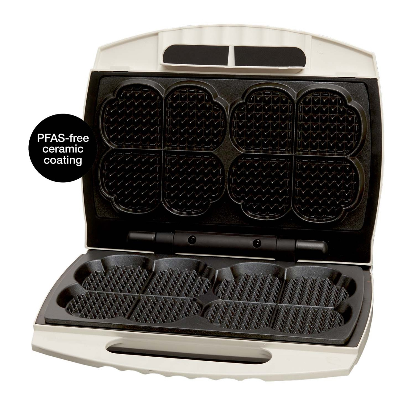 Den keramiska non-stick-beläggningen gör att smeten släpper enkelt och att rengöringen går fort utan krångel även efter flitig användning. Lampor visar när järnet är uppvärmt och klart att börja grädda vilket gör användningen enkel och bekväm i vardagen.