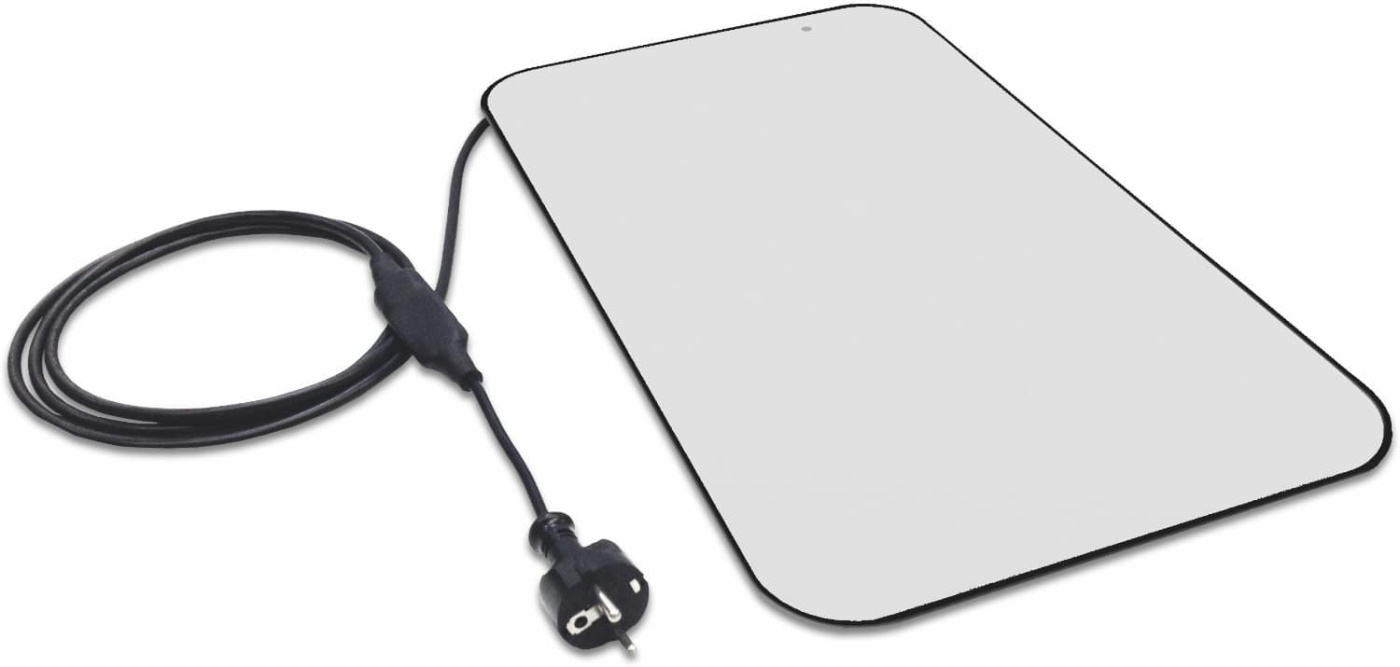 Temperaturbeständig upp till 120°C och stänkskyddad. Mått: 480×280×10 mm, vikt 1,2 kg. Anslutning 230 V.
