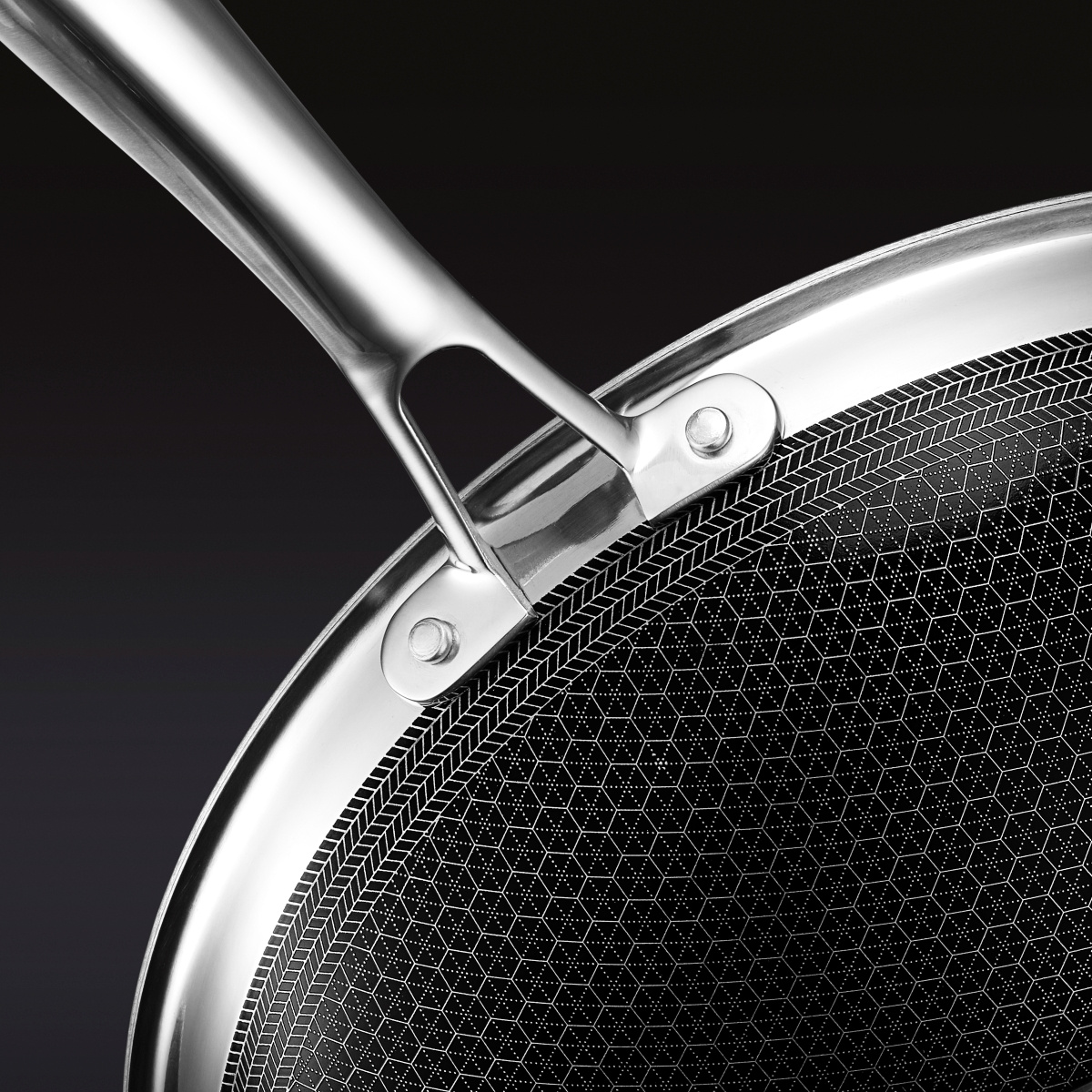 Hybridkonstruktionen kombinerar rostfritt stål med en slitstark, keramisk hybridbeläggning som ger jämn värme och underlättar rengöringen. Den trelagrade botten med rostfritt stål, aluminiumkärna och rostfritt stål ger snabb och jämn värmefördelning över hela botten, vilket är viktigt vid matlagning på hög värme.